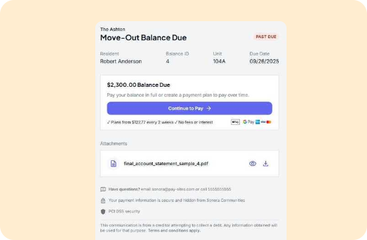 Residents pay in full, make partial payments, or enroll in flexible plans—right from a branded portal that removes manual follow-up from your team.